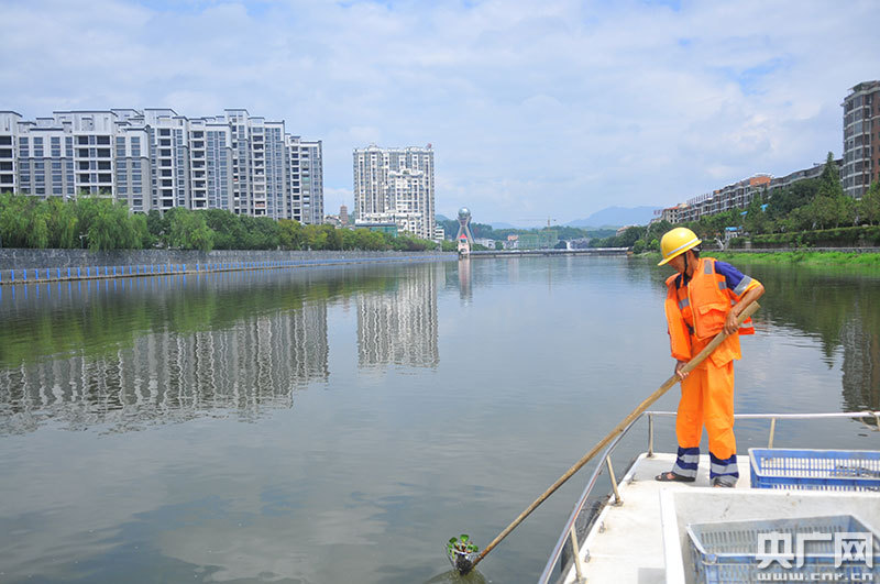 河長制管理責(zé)任人在水上河道監(jiān)管船上打撈漂浮物(央廣網(wǎng)發(fā) 通訊員陳聲年 攝)