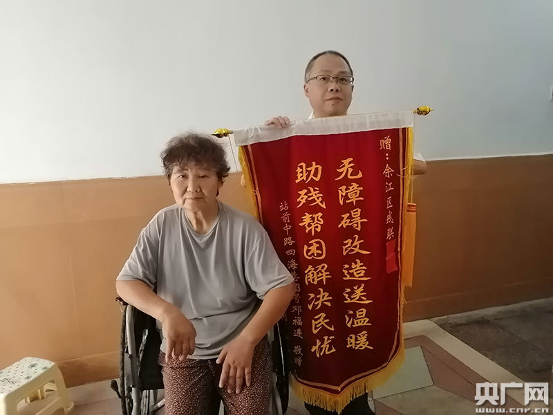 央廣網(wǎng)余江9月18日消息(記者王一凡 通訊員汪有輝)“以前我想爬上二樓簡直是奢望,現(xiàn)在我不但自己能爬上二樓,還能在二樓居住,我太高興了。感謝殘聯(lián)領(lǐng)導(dǎo)的關(guān)心,我難以表述我內(nèi)心的感激之情,所以請人制作了一面錦旗!苯眨衲57歲的鄧福蓮拿著一面寫有“無障礙改造送溫暖,助殘幫困解決民憂”的錦旗,激動地對余江區(qū)殘聯(lián)干部吳永東說道。