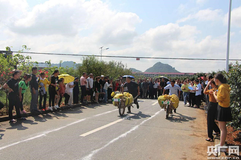 本次農(nóng)民文化運動會,共有9支代表隊96名運動員同臺競技,設(shè)置了推獨輪車、擠扁擔(dān)、負(fù)重挑籮筐、滾輪胎、夫妻組合拔河等五項比賽項目。