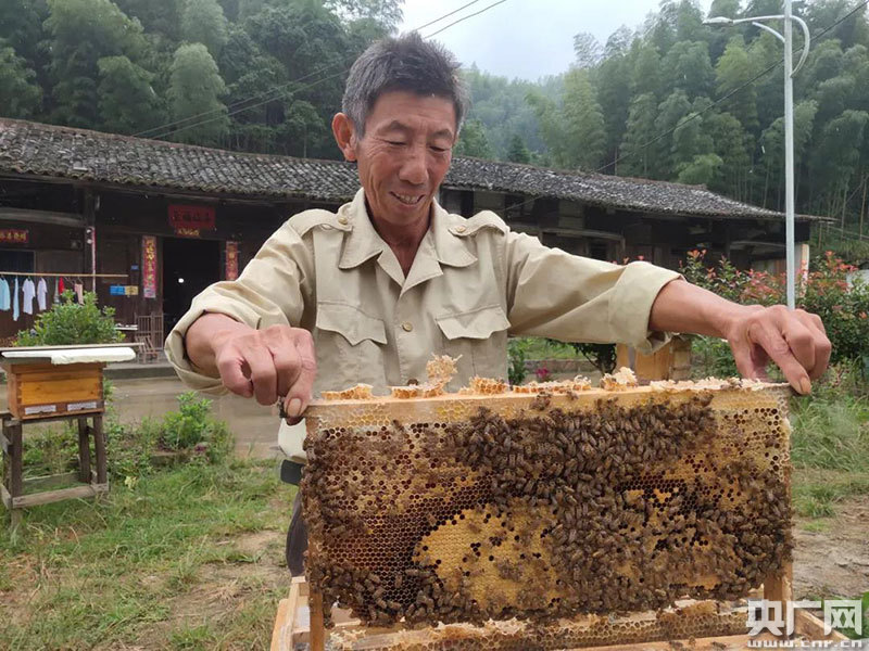 遮雨、保暖、打掃蜂箱、驅(qū)趕“黃蜂”,李良玉愛人黃冬愛說:除了吃飯、上茅廁,李良玉都是窩在蜂箱旁。功夫不負(fù)有心人,當(dāng)年9箱蜂就割蜜超過100斤,賣了5000元。握著紅彤彤的鈔票,李良玉心里十分激動,“蜂兒”在他的心里更寶貝了。為了全面掌握養(yǎng)蜂技術(shù),李良玉自己買養(yǎng)蜂資料,上網(wǎng)看養(yǎng)蜂視頻,遇到不懂的問題就跑合作社問技術(shù)員,很快就成了養(yǎng)蜂行家。在他的細(xì)心呵護下,他家蜂箱第二年增加到20多箱、收蜜超過300斤,第三年增加了31箱、收蜜接近500斤。