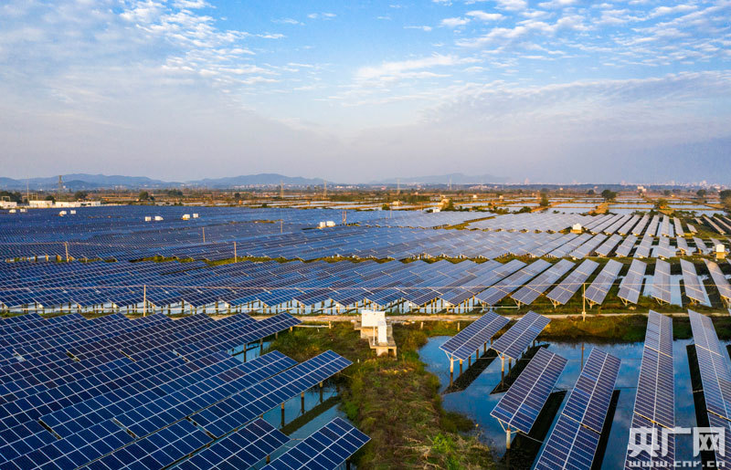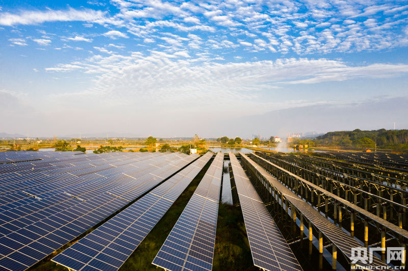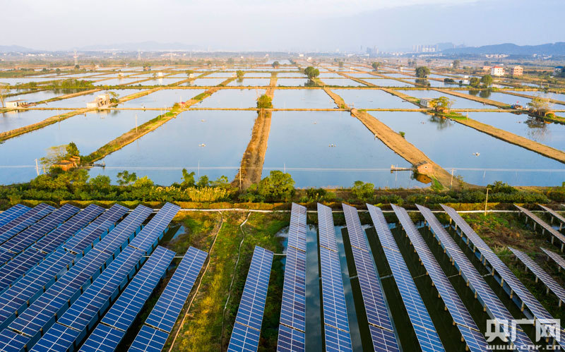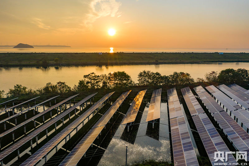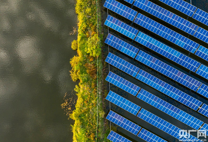 位于江西鄱陽湖畔都昌縣磯山養(yǎng)殖場的漁光發(fā)電項(xiàng)目,在陽光的照耀下熠熠生輝,構(gòu)成一幅秋日美景。近年來,都昌縣利用養(yǎng)殖水面建設(shè)80兆瓦“漁光互補(bǔ)”項(xiàng)目,年均發(fā)電約8000萬千瓦時,“一池兩用”不僅提高了資源利用率,還增加了單位面積土地的經(jīng)濟(jì)價值。