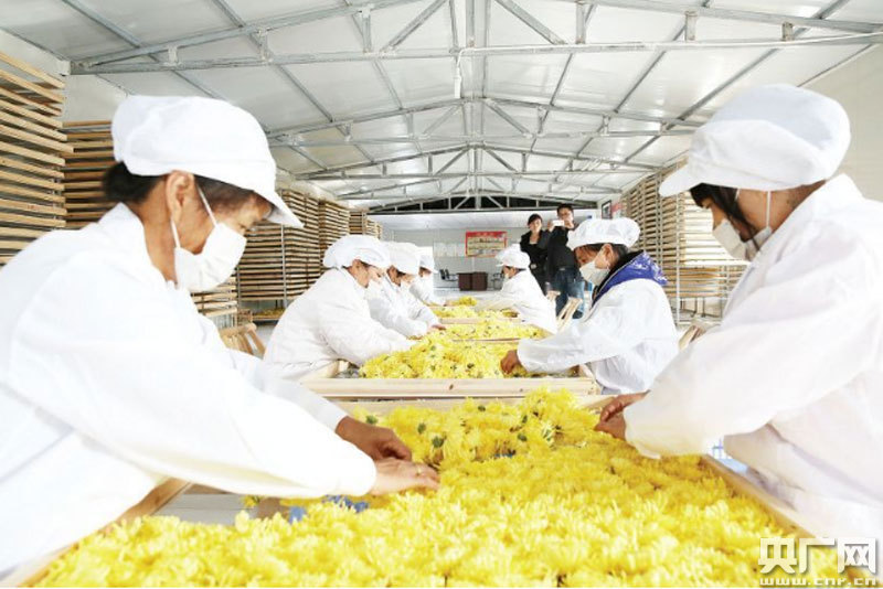 村民正在烘干“金絲皇菊”(央廣網(wǎng)發(fā) 通訊員鄧冬 攝)