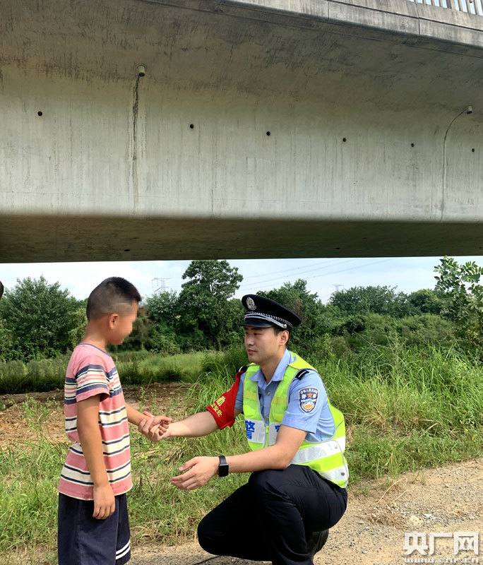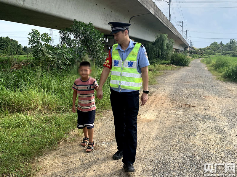 當(dāng)天上午11時許,南昌西車站派出所線路警長楊思齊正帶領(lǐng)民警對管內(nèi)滬昆高鐵線路護欄及橋梁進行治安巡邏,忽然發(fā)現(xiàn)一名紅色衣服的男童正在高鐵橋下行走,而且沒有大人陪伴。細心的楊警官發(fā)現(xiàn)小男孩神情緊張、東張西望,小小的臉蛋被烈日曬得通紅,臉上也掛滿了淚痕。想到這么小的孩子獨自在人跡罕至的高鐵橋下徘徊,一旦遇到不法分子后果可想而知,楊警官立即上前對孩子進行詢問。