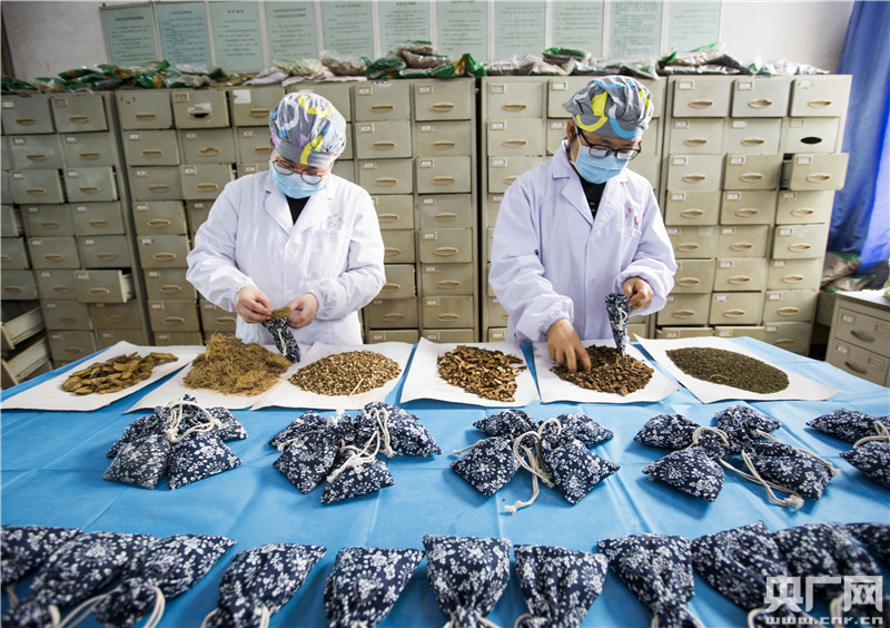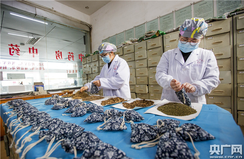 2月24日,在江西省九江市都昌縣中醫(yī)院,藥房工作人員在配制中藥。