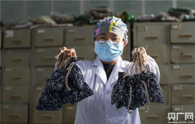 2月24日,江西省九江市都昌縣中醫(yī)院藥房工作人員展示中藥防感香囊。