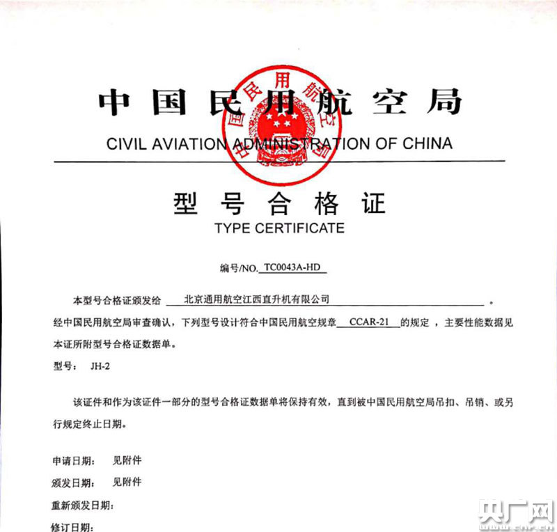 JH—2小朱雀國產輕型直升機型號合格證