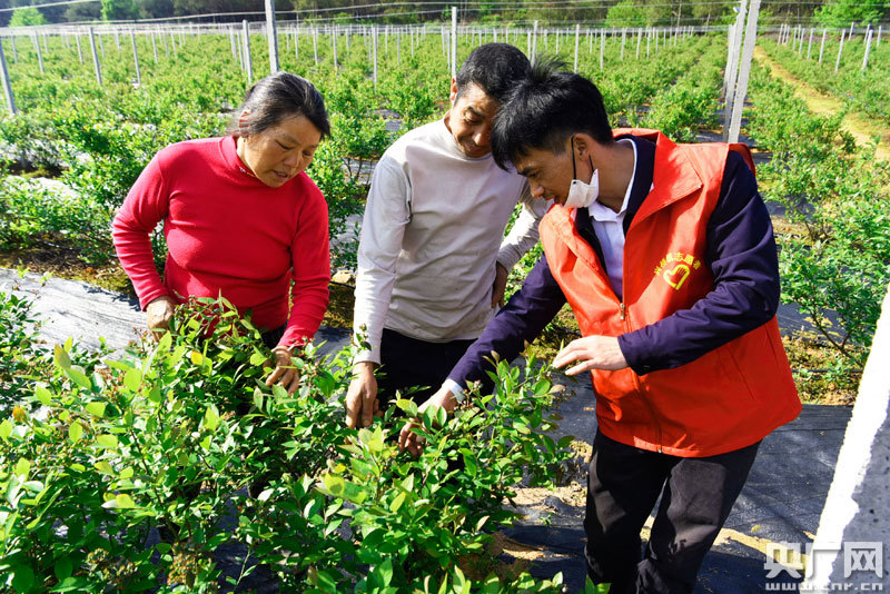 科技員為農(nóng)民講解藍(lán)莓如何提升掛果率