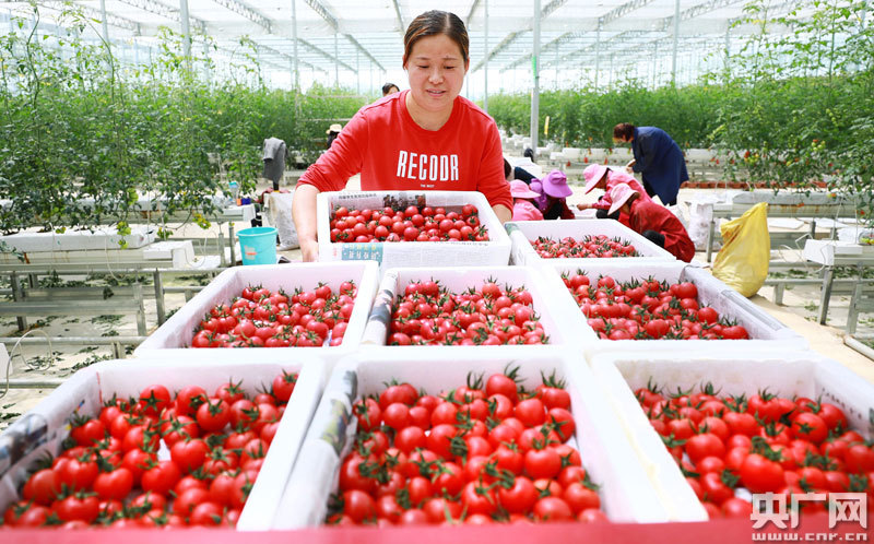 農(nóng)民將采摘的西紅柿分揀裝箱
