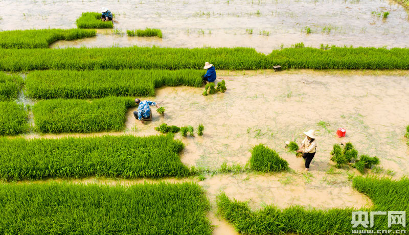 5月12日,江西省九江市都昌縣北山鄉(xiāng)橫山村農(nóng)民在田間栽稻水稻(央廣網(wǎng)發(fā) 通訊員傅建斌 攝)