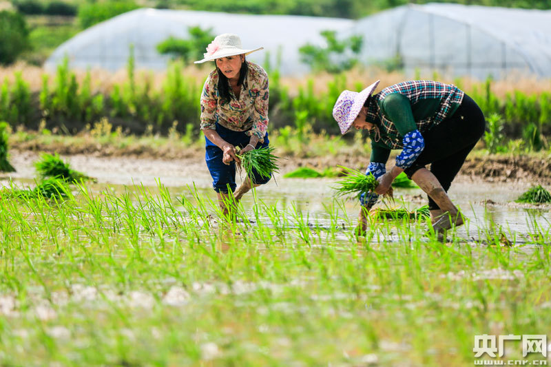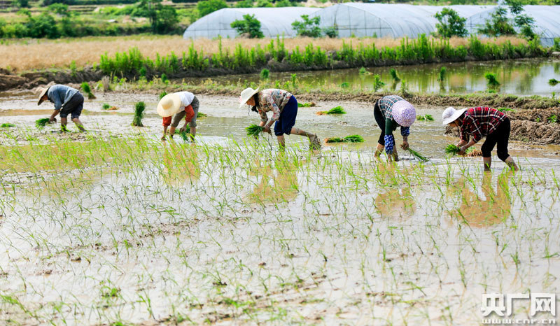 5月13日,江西省九江市都昌縣汪墩鄉(xiāng)古嶺村農(nóng)民在田間栽稻水稻(央廣網(wǎng)發(fā) 通訊員傅建斌 攝)