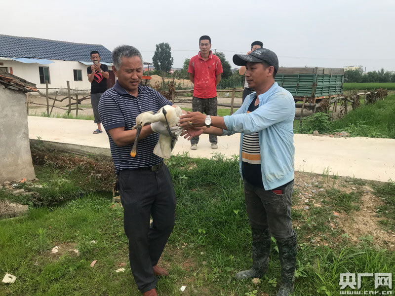 當(dāng)日上午,鴉鵲湖鄉(xiāng)村民萬國勝在田間耕作時,發(fā)現(xiàn)這只受傷的白琵鷺后,立即加以保護并報告了當(dāng)?shù)卮逦瘯袜l(xiāng)政府,縣林業(yè)野保工作人員聞訊后也及時趕到了現(xiàn)場。