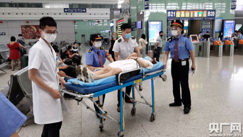 事情要從5月25日上午說起!艾F(xiàn)有旅客突發(fā)疾病,有從事醫(yī)務(wù)工作者的旅客請速與車站工作人員聯(lián)系!”5月25日上午11時,南昌西站候車室響起緊急廣播。原來在B20檢票口座椅上候車的徐女士突然感到肚子疼痛難忍,臉色蒼白并發(fā)出呻吟,讓一旁的家人急得團(tuán)團(tuán)轉(zhuǎn)。正在候車室巡視的客運(yùn)值班員沈佩和高茜看到后,立馬通知廣播尋醫(yī),并立即啟動應(yīng)急預(yù)案,開辟綠色通道,同時撥打120。