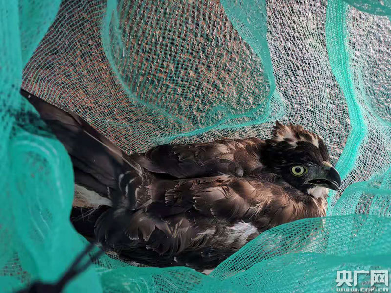 當(dāng)天下午,劉斌接到求助電話后,隨即趕往大塘村。劉斌一番仔細(xì)觀察后,確定大鳥是世界瀕危物種、國家重點二級保護動物鳳頭蒼鷹。這是一只成鳥,體長約50公分,褐色羽毛泛著淡淡光澤,目光凌厲眼睛清澈明亮,鉛褐色的喙尖銳鋒利,時不時張開大嘴,看上去頗為兇猛。