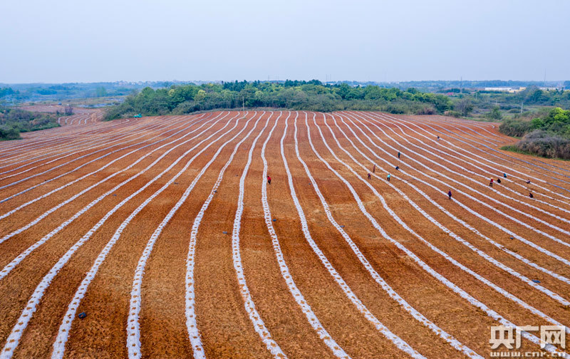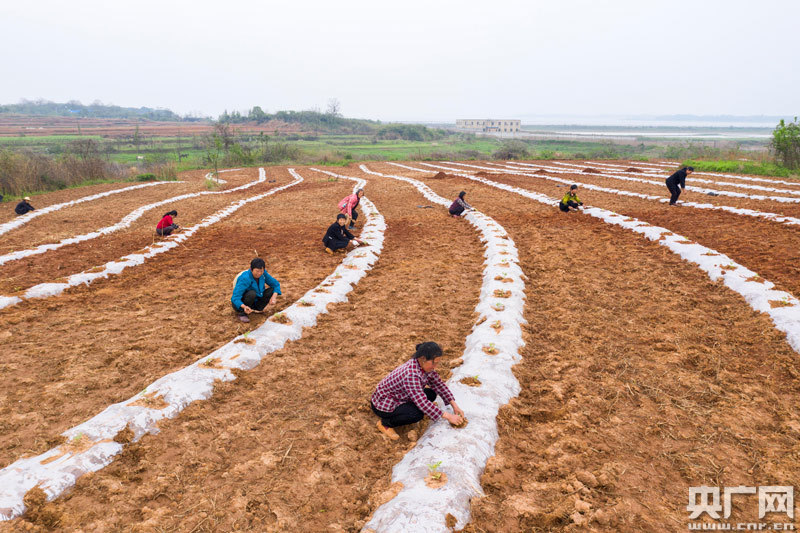 央廣網(wǎng)都昌4月16日消息(記者鄧玉玲 通訊員傅建斌)谷雨時(shí)分,在江西九江市都昌縣萬戶鎮(zhèn)西湖村,鄱陽湖畔地膜縱橫的瓜田從空中俯瞰似一條條“跑道”,貧困農(nóng)戶運(yùn)苗種苗,奔波于“跑道”中間,田間地頭呈現(xiàn)一派繁忙的春種景象。