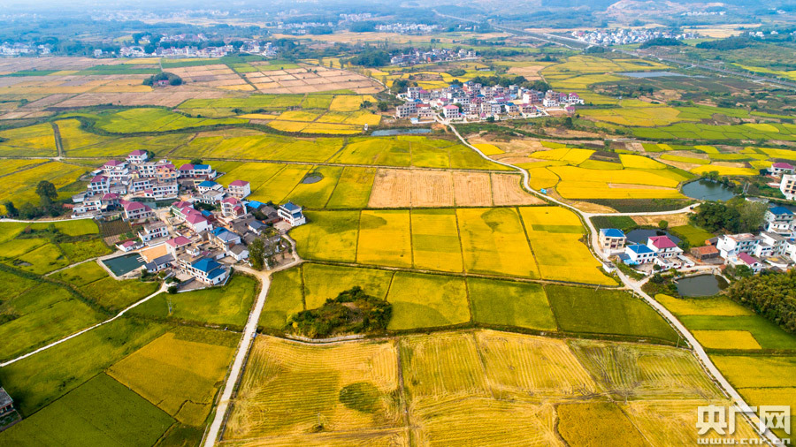 9月27日,素有“贛北糧倉”美譽(yù)的湖口縣武山鎮(zhèn),斑斕大地猶如天然的“調(diào)色盤”。(央廣網(wǎng)發(fā) 通訊員李學(xué)華 攝)