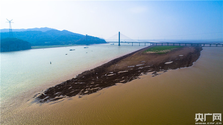 10月10日,鄱陽湖口,往日被湖水淹沒的灘涂大面積顯露出來。(央廣網(wǎng)發(fā) 通訊員李學(xué)華攝)
