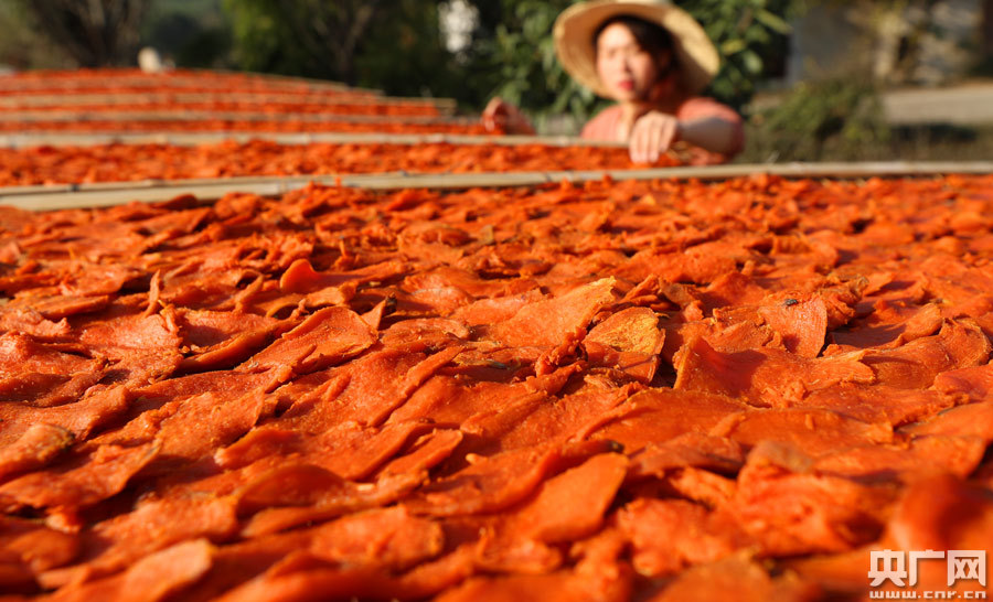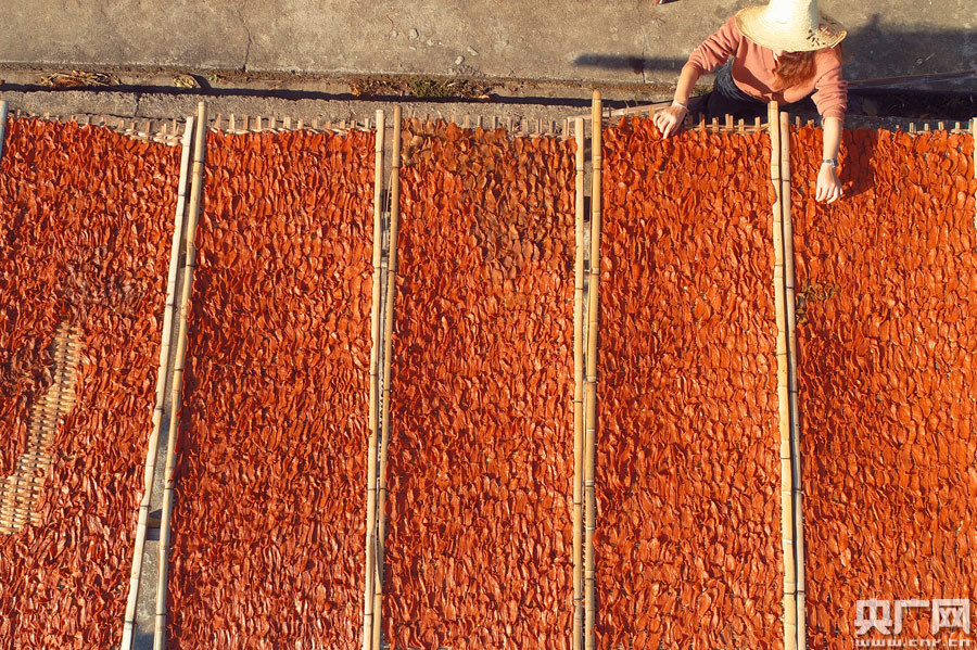 11月22日,在江西省吉安市泰和縣水槎鄉(xiāng)浪川村,農(nóng)民搶抓晴好天氣正在晾曬紅薯干。近年來,泰和縣依托本地紅薯種植廣泛的優(yōu)勢,積極推進紅薯等特色農(nóng)產(chǎn)品深加工,提升附加值,通過農(nóng)村電商平臺,實現(xiàn)網(wǎng)上銷售,助推農(nóng)業(yè)高質(zhì)量發(fā)展,助力農(nóng)民增收致富。(央廣網(wǎng)發(fā) 通訊員鄧和平攝)
