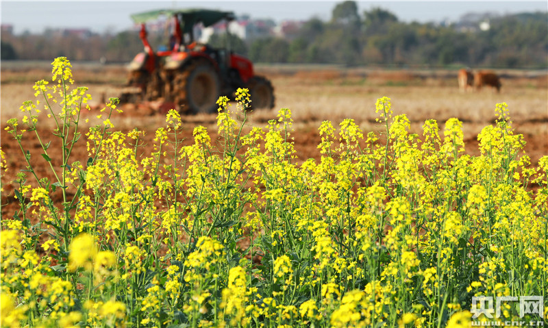 農(nóng)民勞作的身影和金黃的油菜花、寧靜的村莊、悠閑吃草的耕牛、翠綠的青山相映成趣,勾勒出一幅如詩如畫的春耕圖景,美不勝收,令人陶醉。