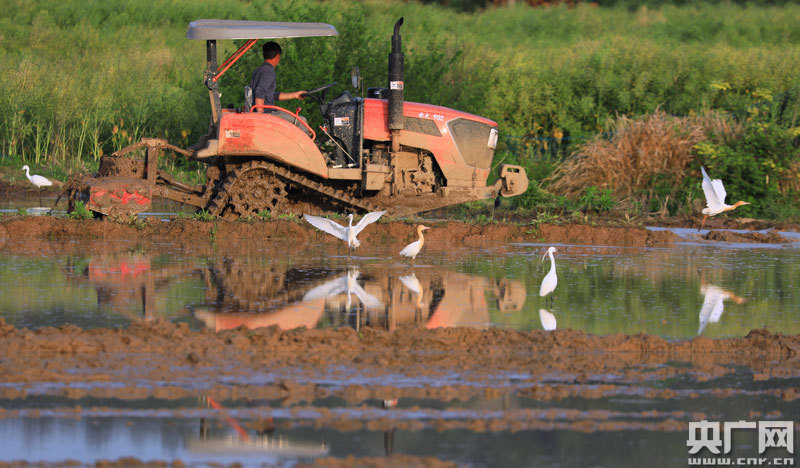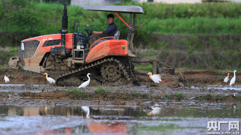 4月13日,在江西省吉安市泰和縣南溪鄉(xiāng)芳橋村,農(nóng)民翻耕農(nóng)田,白鷺嬉戲覓食,相映成趣(央廣網(wǎng)發(fā) 通訊員司馬天民 攝)
