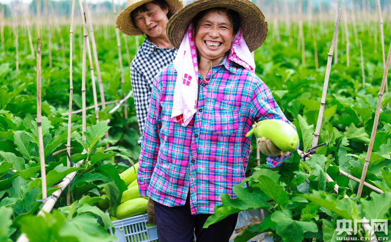 5月25日,在江西省吉安市泰和縣上模鄉(xiāng)老居村無公害蔬菜生產(chǎn)基地,農(nóng)民將采收的茄子分揀打包