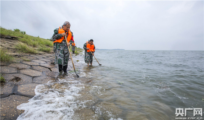 7月5日,在江西鄱陽湖都昌磯山下壩,北山鄉(xiāng)黨員干部在壩外巡查險情。(央廣網發(fā) 通訊員傅建斌 攝)