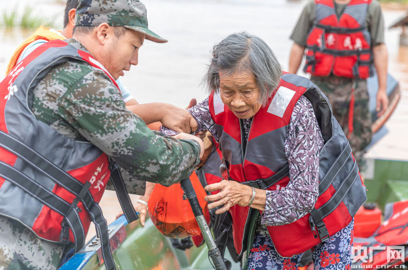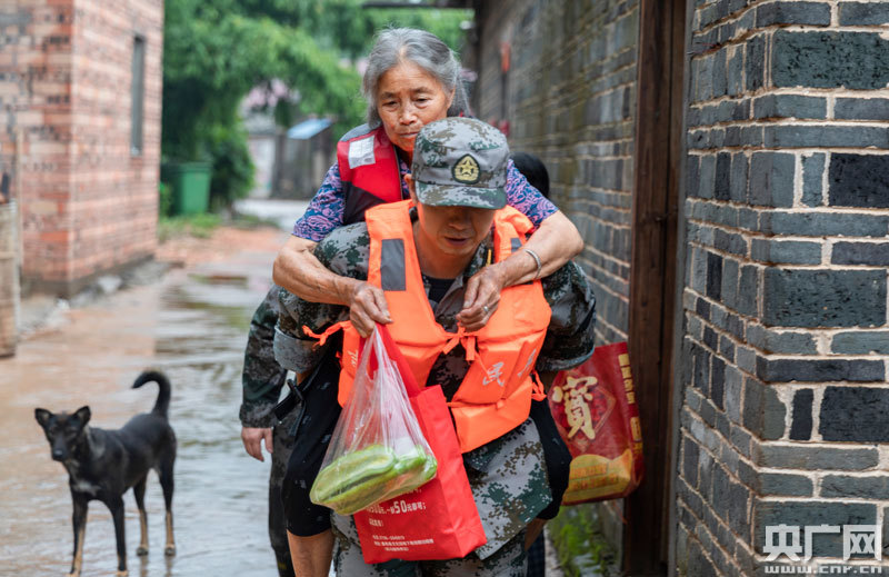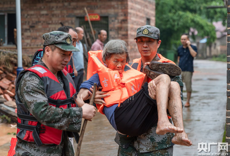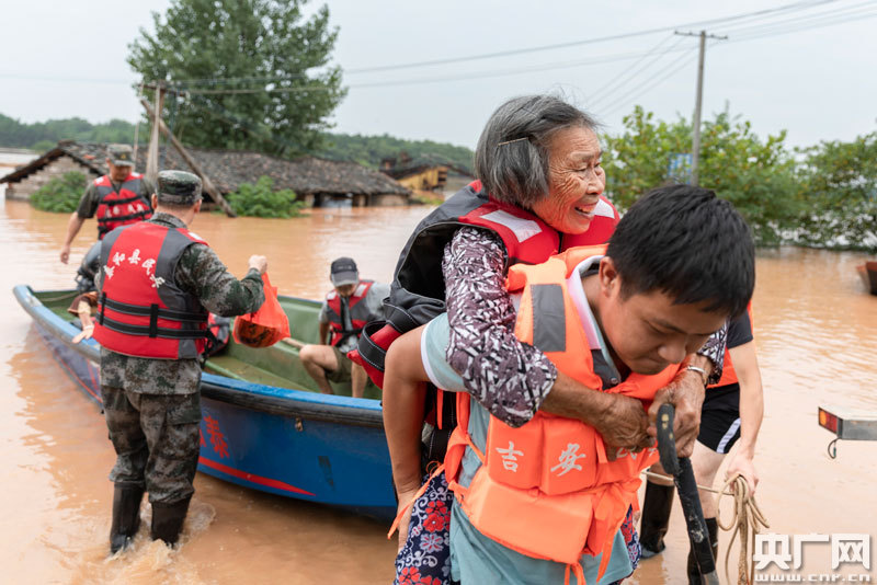 7月10日,在泰和縣石山鄉(xiāng)社背村,人武官兵將被困村民轉(zhuǎn)移到安全地帶