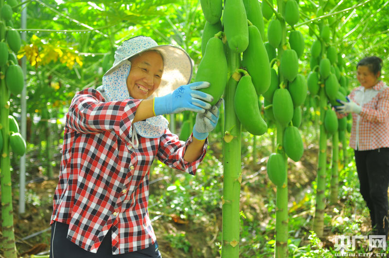 貧困戶廖義妹在正河村扶貧產(chǎn)業(yè)基地采摘木瓜(央廣網(wǎng)發(fā) 通訊員陳聲年 攝)
