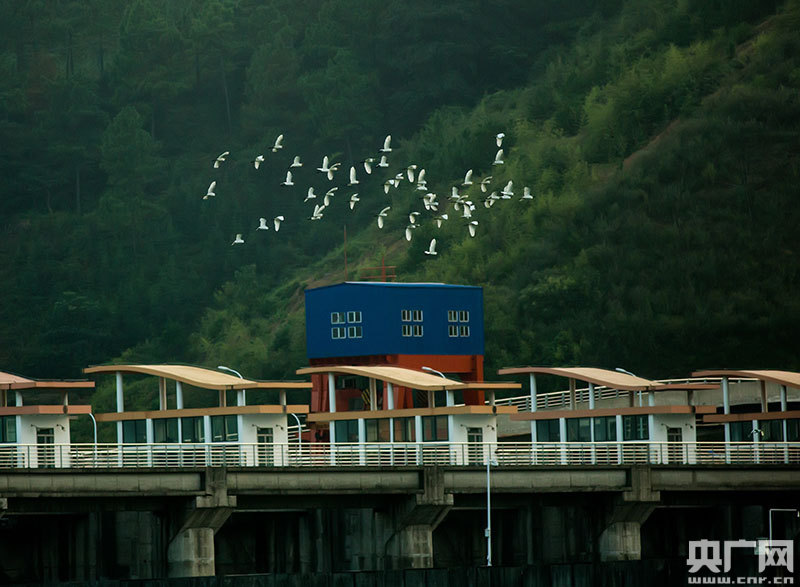 在江西峽江縣水利樞紐灘頭,八九月份時(shí)大壩蓄水位低,緩緩江水碧波蕩漾。每當(dāng)朝陽或夕陽西下的時(shí)候,時(shí)不時(shí)就有群群白鷺翱翔在大壩上空。