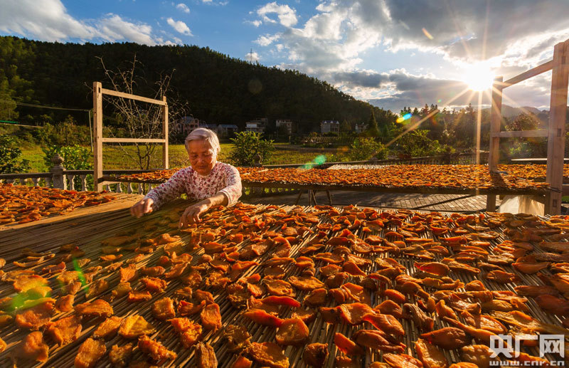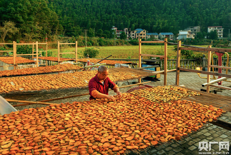 央廣網(wǎng)永新11月26日消息(記者謝元森 通訊員朱國朝 周亞茂)初冬時節(jié),江西省永新縣三灣鄉(xiāng)三灣村的庭院里一片忙碌景象,村民們忙著清洗番薯、切薯條、曬薯干,供應(yīng)市場。三灣村是著名的“三灣改編”發(fā)生地,也是國家4A級旅游景區(qū)——三灣改編景區(qū)所在地。近年來,該村鼓勵村民把自種的紅薯加工成薯干,作為土特產(chǎn)銷售給游客,增加農(nóng)民收入。圖為江西省永新縣三灣村村民在晾曬紅薯干。