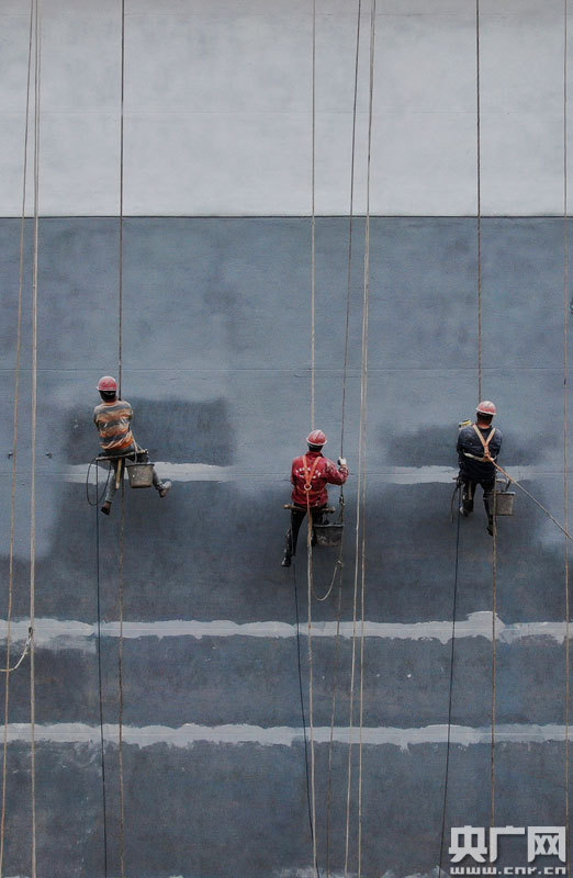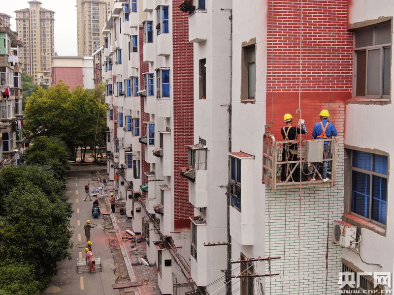 在該區(qū)古南鎮(zhèn)街道桃樹(shù)下社區(qū)如意苑小區(qū),工人正在進(jìn)行外墻改造(央廣網(wǎng)發(fā) 通訊員李軍 攝)