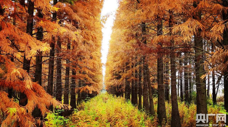 有的水杉根部全部浸泡在水中,水中有樹,樹向水生,呈現(xiàn)出一幅碧水紅杉的動(dòng)人畫卷。有的與翠綠草叢相互依偎,芳華畢露,美不勝收。