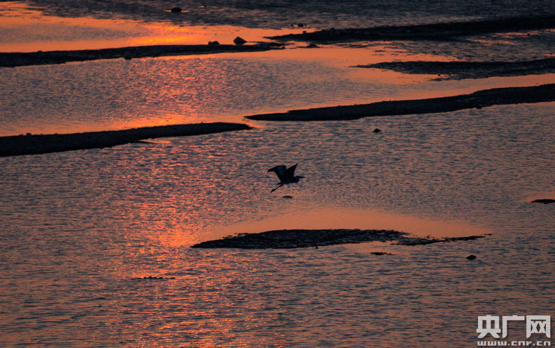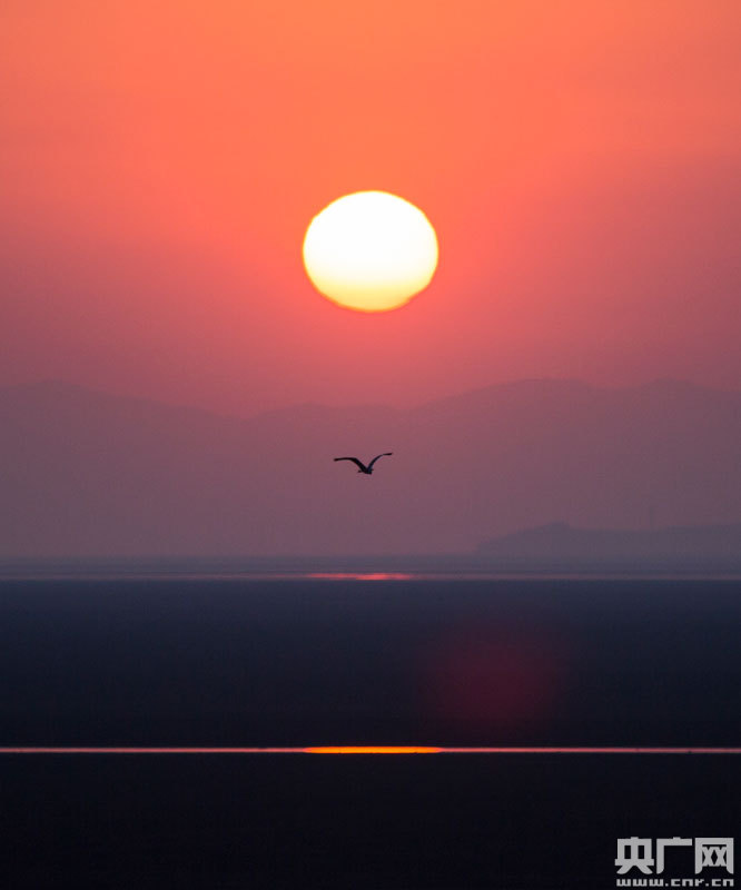 黃昏時分,在江西鄱陽湖都昌馬影湖水域,蒼鷺從夕陽下飛過