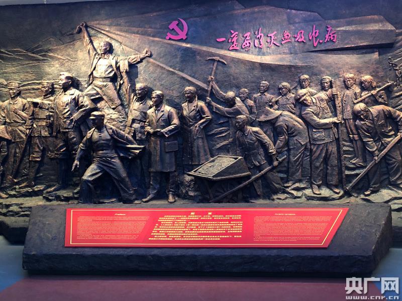 中國(guó)血防紀(jì)念館展示的滅螺大會(huì)的大型浮雕(央廣網(wǎng)發(fā) 趙小羽攝)