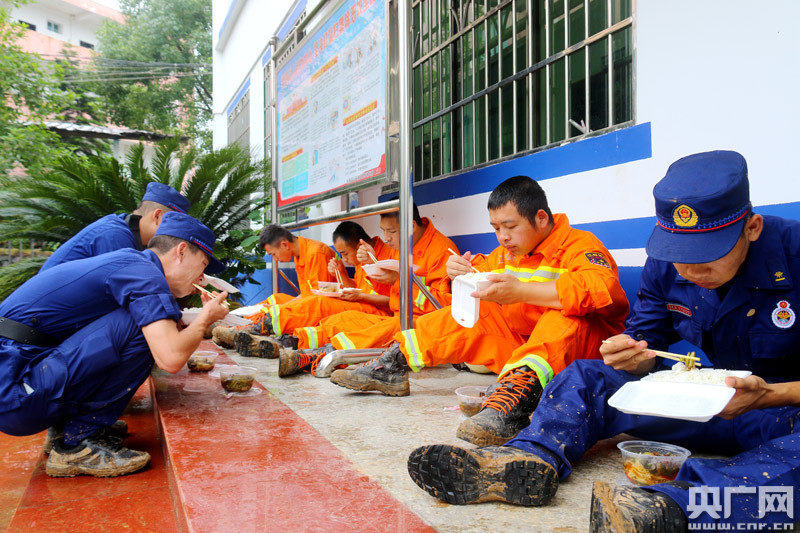 6月12日下午1點(diǎn),參與抗洪救災(zāi)的全南縣消防救援隊(duì)員坐在地上用午餐。(通訊員李大軍/攝)