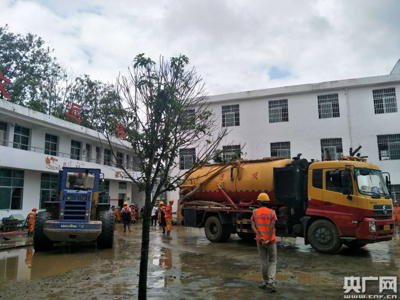 帶著9名工人風(fēng)塵仆仆趕到的譚軍輝顧不上休息,第一時(shí)間加入了勞動(dòng)隊(duì)伍。在專業(yè)設(shè)備的作業(yè)下,校園環(huán)境整治工作迅速開啟了“修復(fù)模式”:排水溝渠清淤清雜,過道操場“擦臉除垢”,高壓水車沖洗殘泥……覆蓋校園的4萬余方淤泥垃圾,在短短一天半的時(shí)間內(nèi)就清理完畢。