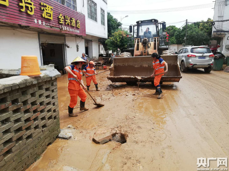 北控工作人員在大吉山鎮(zhèn)圩鎮(zhèn)清理泥沙