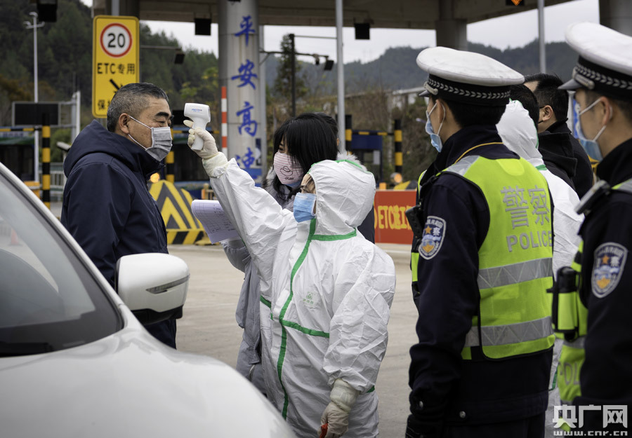 醫(yī)護(hù)人員在全南高速公路出口為來(lái)往車輛人員進(jìn)行體溫檢測(cè)