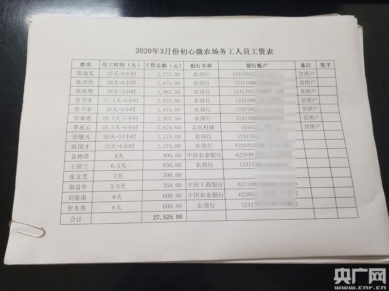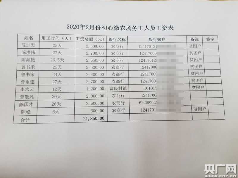 初心微農(nóng)場工作人員王瑤向記者介紹:“曾垂連是最勤快的一個,多勞多得嘛,他平均每個月有近3000元工資,二月份受了一點影響,但還是工資最高的一個,F(xiàn)在農(nóng)場全面復工復產(chǎn),一季度共給8位貧困戶共發(fā)放66000余元工資,平均每個貧困戶每月都能拿到2000多元。”