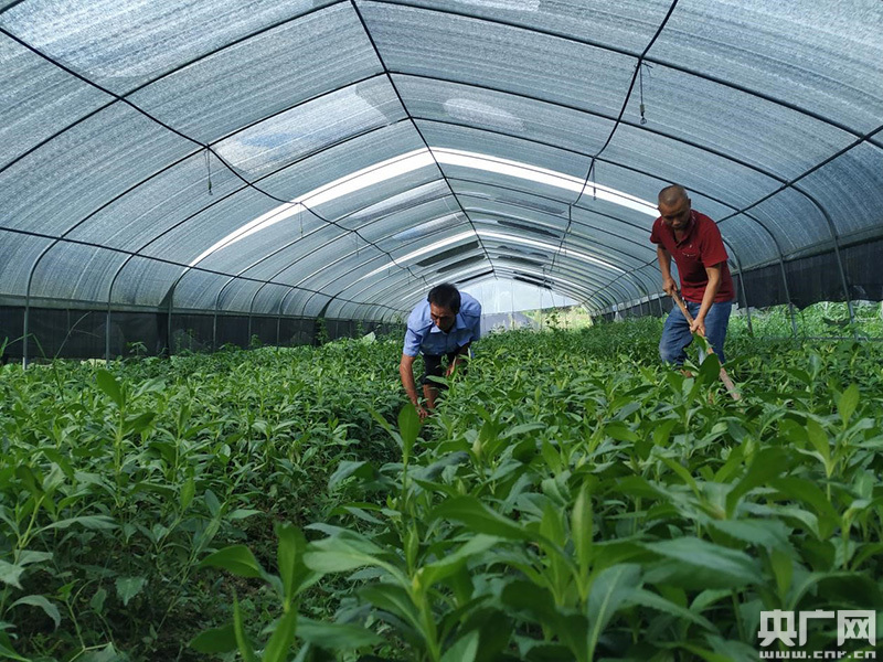 鐘良柱(左一)在草珊瑚基地務(wù)工(央廣網(wǎng)發(fā) 通訊員鐘慧燕 攝)
