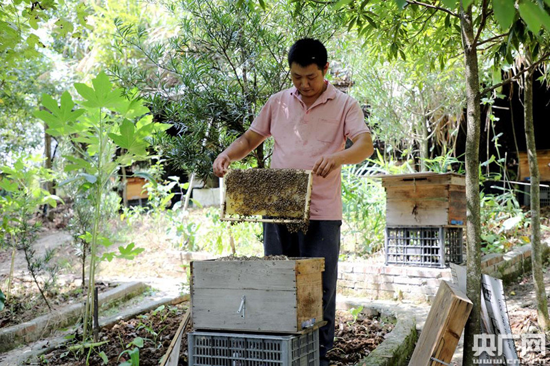 郭偉全在查看蜜蜂結(jié)蜜情況(央廣網(wǎng)發(fā) 通訊員尹其奇 攝)