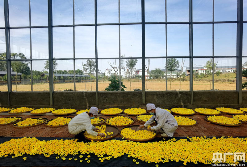 工作人員正在分揀新鮮采摘的金絲皇菊(央廣網發(fā) 通訊員供圖)