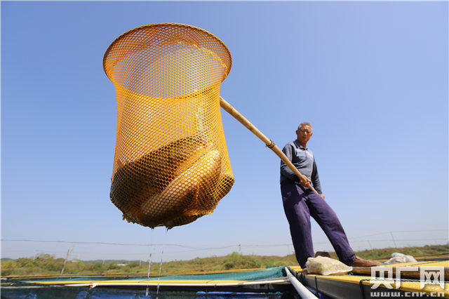 安福縣和誠(chéng)畜牧有限公司員工藍(lán)宗招在捕撈倒刺鲃魚。(央廣網(wǎng)發(fā) 通訊員劉麗強(qiáng)攝影)