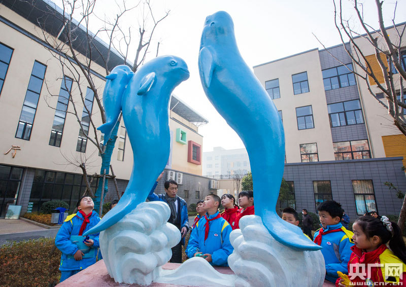 在該校江豚雕塑前,江豚保護志愿者為學生科普江豚知識(央廣網(wǎng)發(fā) 通訊員傅建斌 攝)
