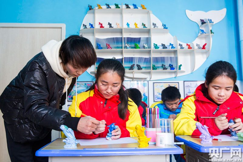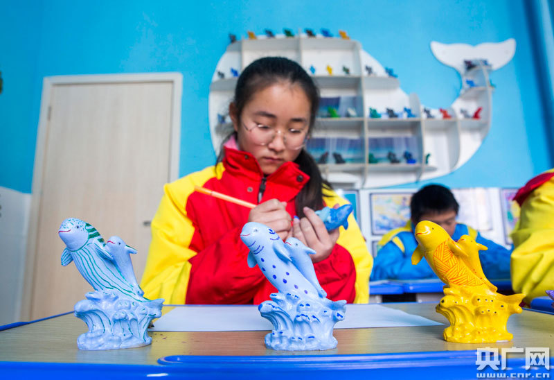 在“江豚教室”,學生在手繪江豚模型(央廣網(wǎng)發(fā) 通訊員傅建斌 攝)