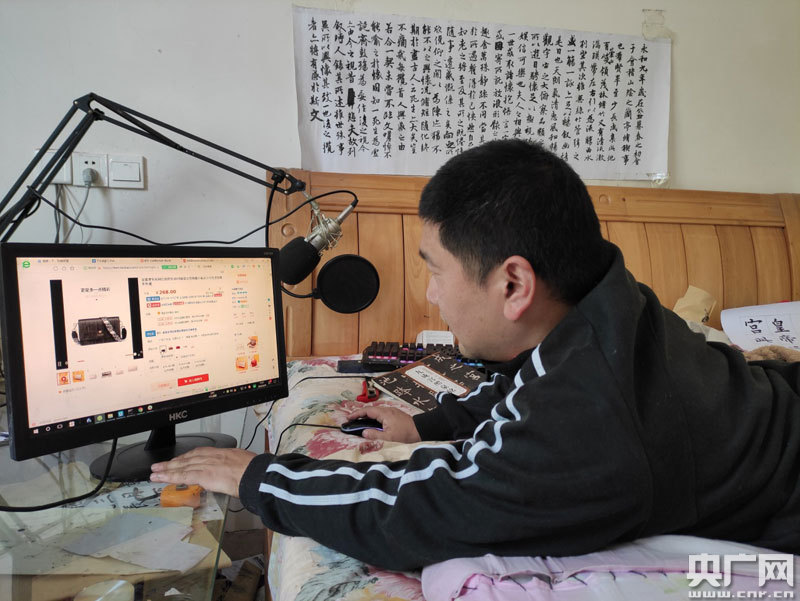 周應紅,既是一位“無腳”貧困戶,又是一名網(wǎng)絡主播,還是一個淘寶店主。既知維修家電,又能詩歌朗誦,還會軟筆書法。由于身患殘疾、行動不便,臥室成了他的“工作室”,電腦成了他的“鐵飯碗”,書法成了他的“好朋友”。走進他的家中,首先映入眼簾的是墻上的一幅字畫——《陋室銘》!八故锹,惟吾德馨”,仿佛就是這位貧困戶的真實寫照。