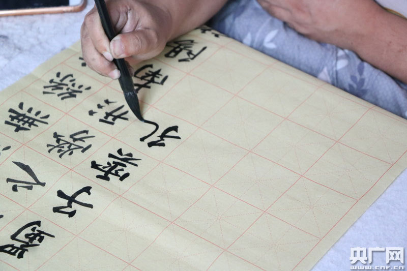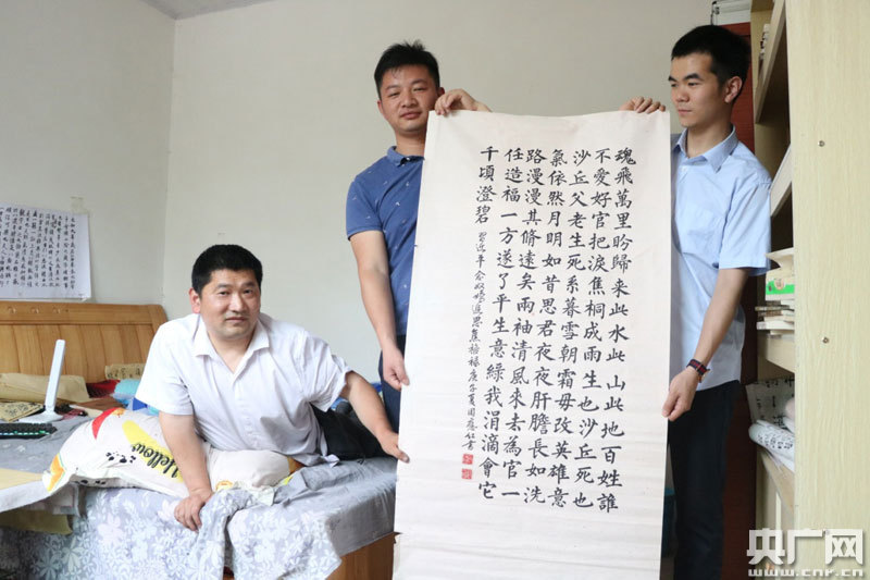 受父親影響,周應紅自小就萌生了對書法的熱愛。雙腿殘疾后,他只能躺在床上,無法外出活動。一天,哥哥帶來一本柳公權字帖,遒勁嚴謹?shù)淖煮w深深震撼了周應紅,幼時的熱愛一瞬涌上心頭。“有一次,父親拿起我躺在床上隨手寫的書法,說了句‘沒想到這孩子的書法寫的還挺好’”。父親的贊賞另他備受鼓舞,也堅定了他的書法之路,不能翻身,他就舉著毛筆躺著練,這一躺就是五年。