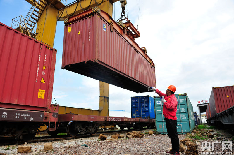 發(fā)車前南昌向塘口岸起吊集裝箱裝車