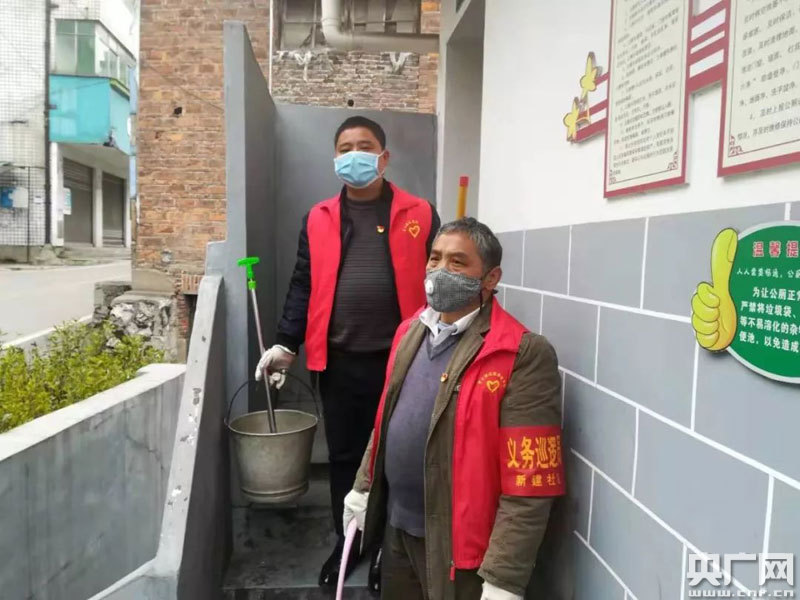 廖日峰帶領(lǐng)社區(qū)志愿者給公共廁所消毒