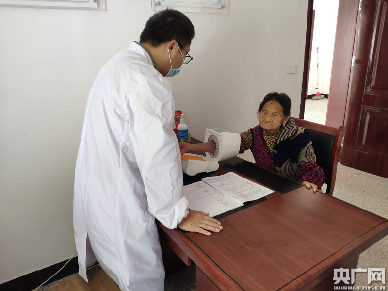 曉康診所醫(yī)生在湖澤鎮(zhèn)鬧洲村洋龍山頤養(yǎng)之家為老人檢查身體(央廣網(wǎng)發(fā) 通訊員供圖)