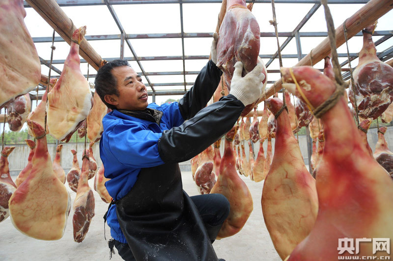1月2日,江西省吉安市安?h楓田鎮(zhèn)一家民營(yíng)火腿公司員工在晾曬火腿。(央廣網(wǎng)發(fā) 通訊員劉麗強(qiáng)攝)